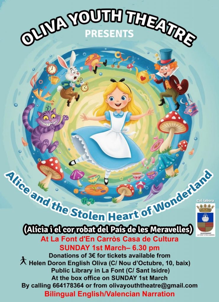 Oliva Youth Theatre are delighted to announce that the premier of our new musical based on Alice in Wonderland takes place in the Casa de Cultura in La Font d'en Carros on Sunday 1st March at 6.30pm.